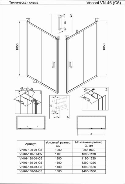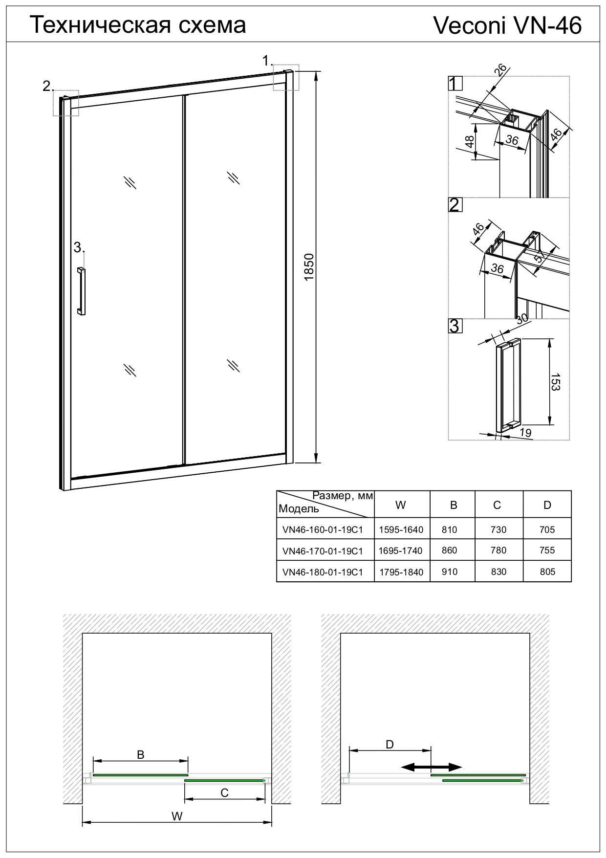 Душевая дверь Veconi Vianno VN-46, 1500x1950, хром, стекло прозрачное купить