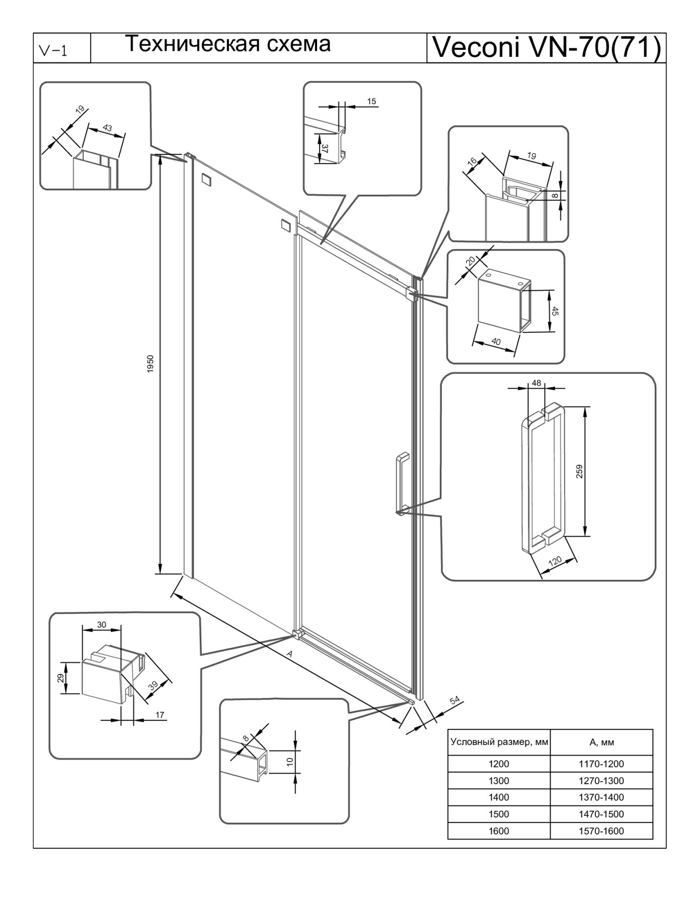Душевая дверь Veconi Vianno VN-70CH, 1200x1950, хром, стекло прозрачное