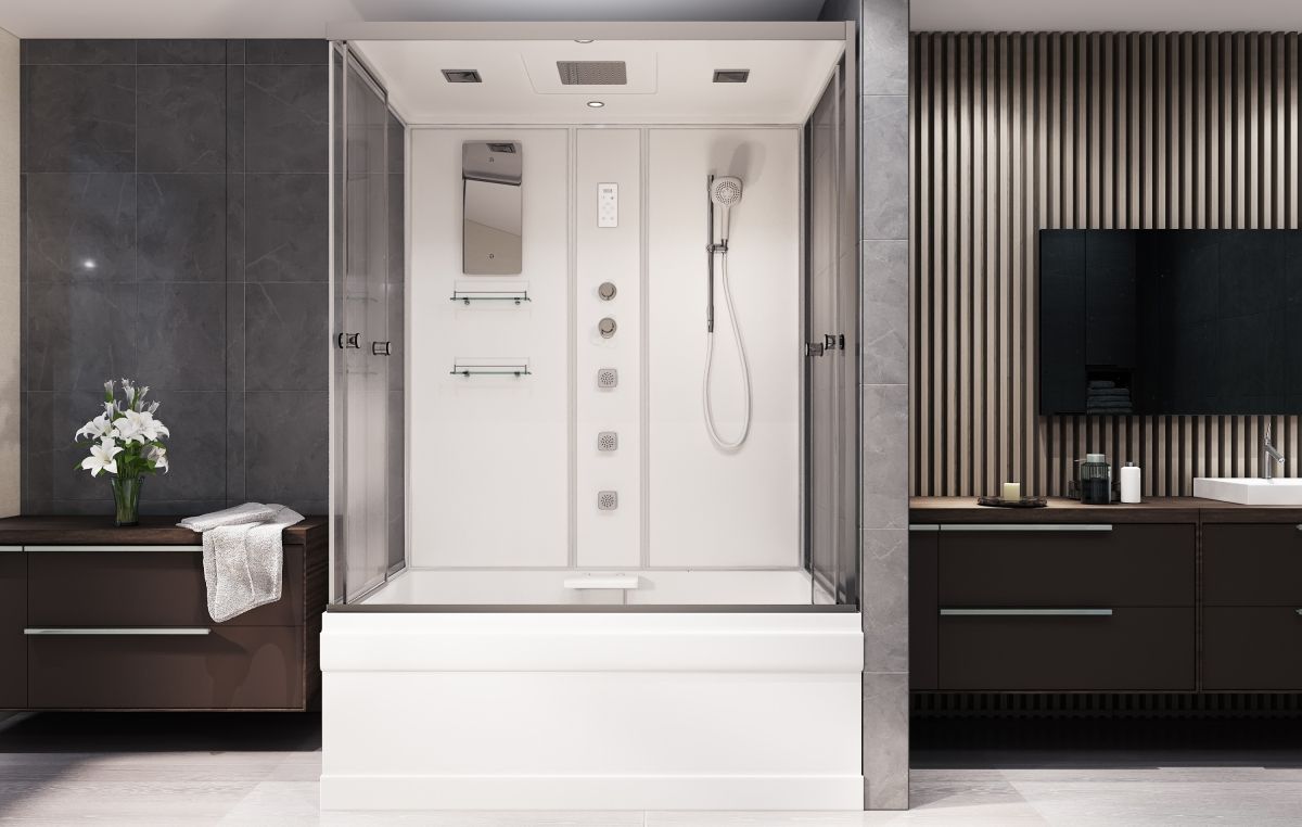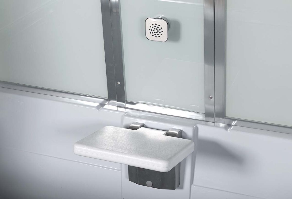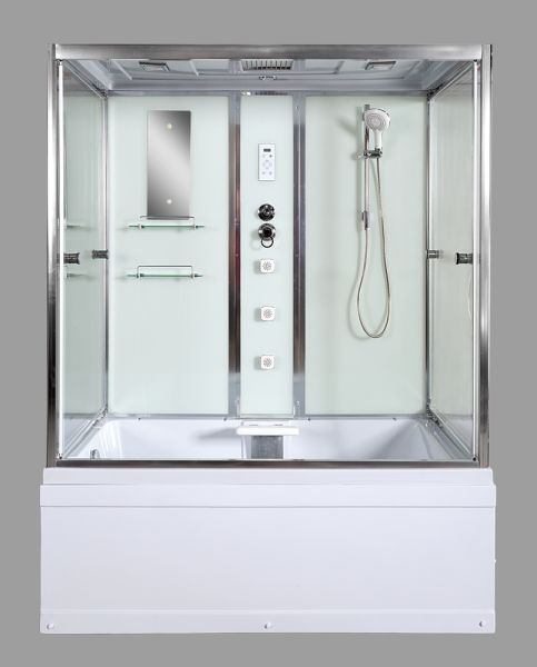 Стильная душевая кабина с внутренней сборкой AvaCan V170 сочетает в себе высокую функциональность, практичность и надежность. Для изготовления применяют безопасное закаленное стекло толщиной 5 мм, надежно фиксируемое алюминиевым профилем. Цвет профиля хром. В комплекте зеркало, сенсорный пульт управления, передний съемный экран, донный клапан (клик-клак), душевой гарнитур, тропический (верхний) душ, полочки, откидное сиденье, гидромассажные форсунки, смеситель, переключатель режимов, тропический (верхний) душ, вентиляция, радио.