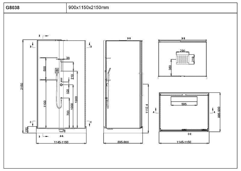 Габариты душевой кабины (ШхВхД): 1150х2150х900 мм.