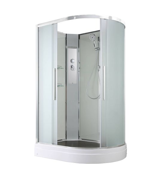 Стильная душевая кабина AvaCan EM2812LN сочетает в себе высокую функциональность, практичность и надежность. При изготовлении применяется безопасное закаленное стекло толщиной 5 мм (матовое), надежно фиксируемое алюминиевым профилем. Сборка без силикона (увеличивает срок службы), внутренняя сборка(облегчает установку и ревизию; позволяет установить в ограниченном пространстве), смеситель резьбовой (без хомутов). Съемный экран поддона (позволяет осуществлять ревизию сифона). Цвет профиля  хром. Двойные металлические ролики дверей (увеличивают срок службы).В комплекте : душевая штанга, две полочки , арома-лейка с витамином С (картридж съемный),полимерная вставка в поддон(имитация дерева),сифон, ручки дверей из нержавейки , двойные ролики .