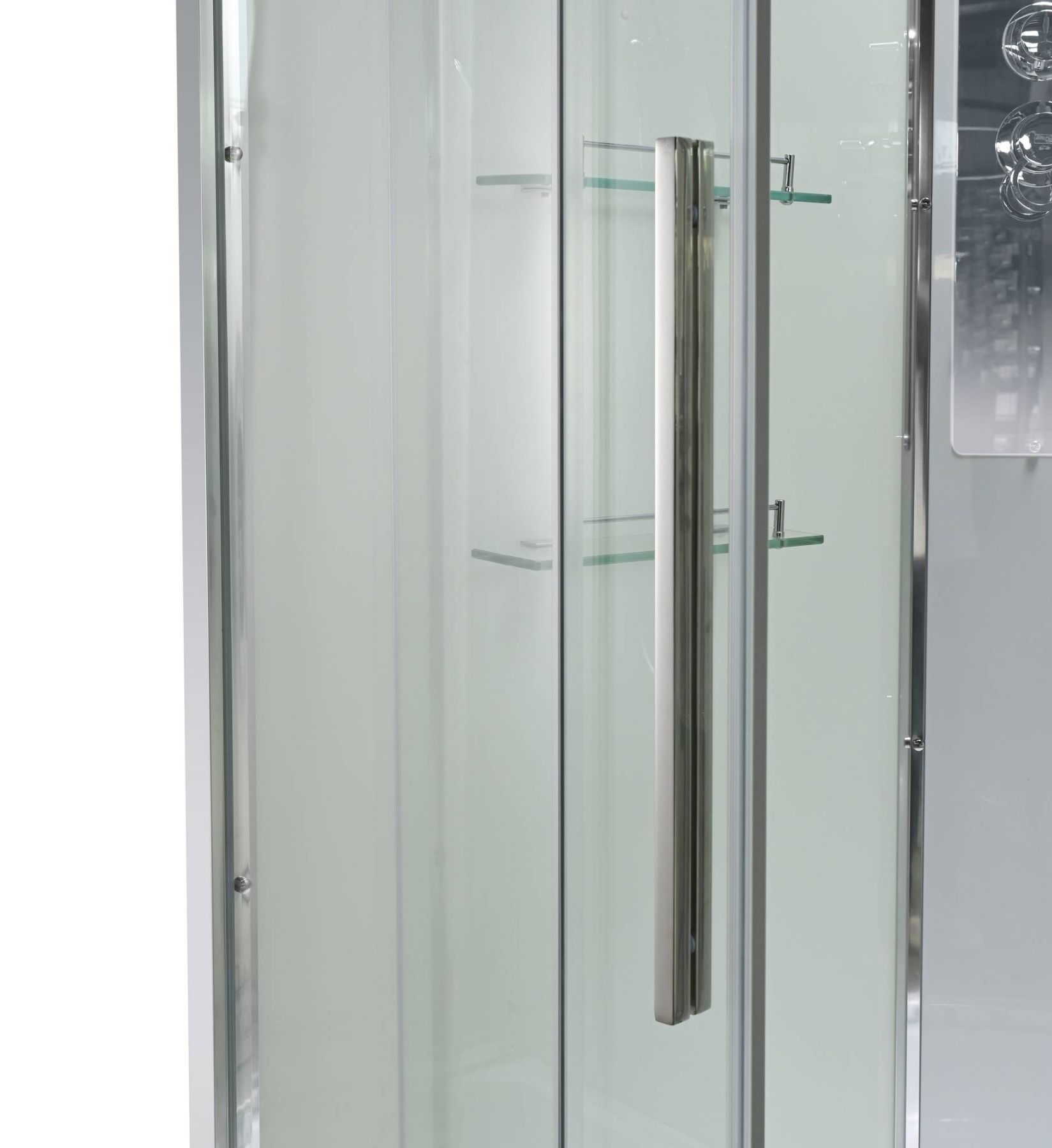 Стильная душевая кабина AvaCan сочетает в себе высокую функциональность, практичность и надежность. При изготовлении применяется безопасное закаленное стекло, надежно фиксируемое алюминиевым профилем. Профиль сделан из алюминия повышенной прочности. Сборка без силикона (увеличивает срок службы, защищает от протечек), внутренняя сборка (облегчает установку и ревизию; позволяет установить в ограниченном пространстве и обойтись без демонтажа других сантехнических приборов), смеситель резьбовой (без хомутов). Съемный экран поддона (позволяет осуществлять подключение и ревизию сифона).Двойные металлические ролики дверей (распределение нагрузки на два ролика, увеличивают срок службы). Душевая штанга(позволяет регулировать по высоте ручную лейку), ручная арома-лейка с витамином С (картридж в комплекте,есть возможность замены или удаления картриджа), полочки(из стекла, с ограничителем), сифон с гидрозатвором.