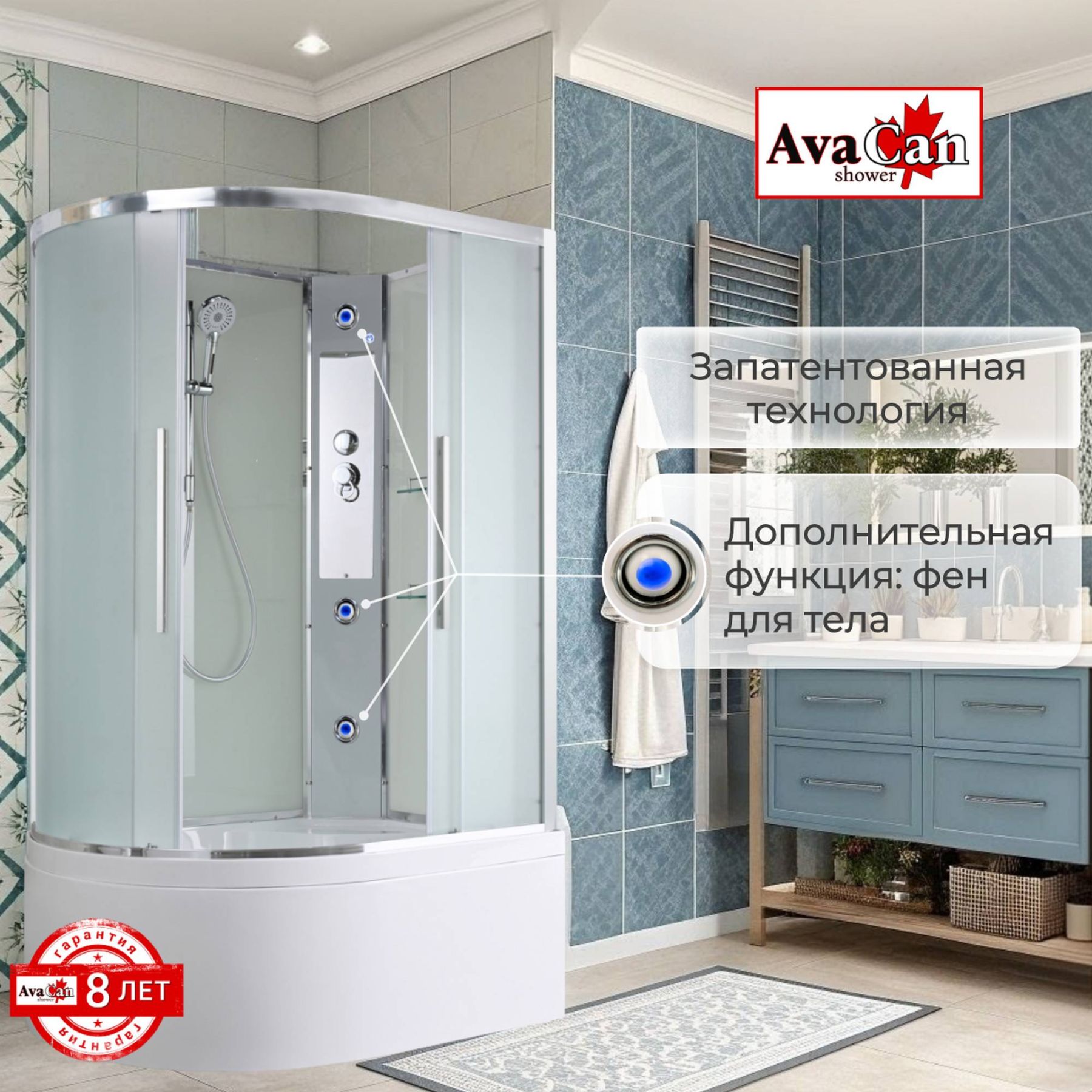 Стильная душевая кабина AvaCan сочетает в себе высокую функциональность, практичность и надежность. При изготовлении применяется безопасное закаленное стекло, надежно фиксируемое алюминиевым профилем. Профиль сделан из алюминия повышенной прочности. Сборка без силикона (увеличивает срок службы, защищает от протечек), внутренняя сборка (облегчает установку и ревизию; позволяет установить в ограниченном пространстве и обойтись без демонтажа других сантехнических приборов), смеситель резьбовой (без хомутов). Съемный экран поддона (позволяет осуществлять подключение и ревизию сифона).Двойные металлические ролики дверей (распределение нагрузки на два ролика, увеличивают срок службы). Душевая штанга(позволяет регулировать по высоте ручную лейку), ручная арома-лейка с витамином С (картридж в комплекте,есть возможность замены или удаления картриджа), полочки(из стекла, с ограничителем), сифон с гидрозатвором.