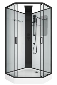 Пятиугольная душевая кабина Grossman GR-250D выглядит лёгкой и невесомой несмотря на довольно просторные габаритные размеры 100 на 100 см. Всё дело в дизайне, в котором белоснежный поддон и задние стенки кабины подчёркнуты строгим чёрным профилем. При этом переднее ограждение полностью прозрачное. Широкая центральная стойка также в матовом чёрном цвете размещена в установочном углу. Визуально облегчает конструкцию и отсутствие крыши. При этом данная модель оборудована верхним тропическим душем. Его лейка является продолжением центральной стойки. Помимо него есть и ручной душ. Его лейку можно установить на удобной высоте при помощи держателя на штанге. Они также выполнены в чёрном цвете.