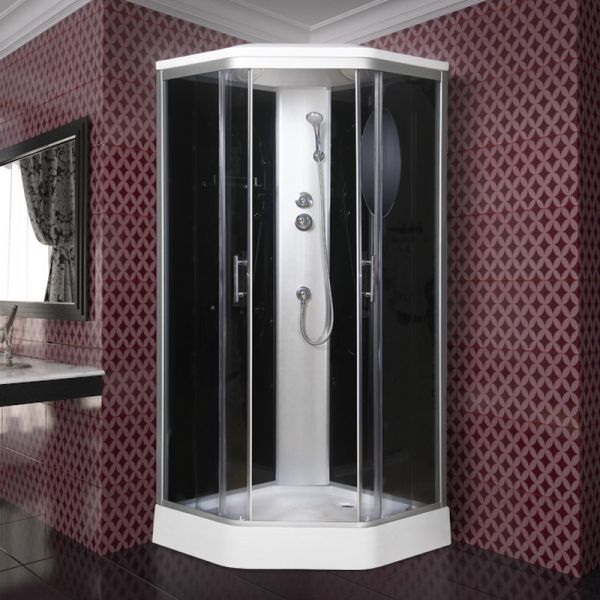 Поддон акриловый низкий 16см(трапеция), глубина 5см, сифон с гофрой,экран несъемный,профиль матовый хром, центральная панель серебро, задние стенки закаленные,черные,крашенные, передние стекла закаленные,тонированные, смеситель 2-х режимный, полочка,зеркало,верхний душ,ручной душ.