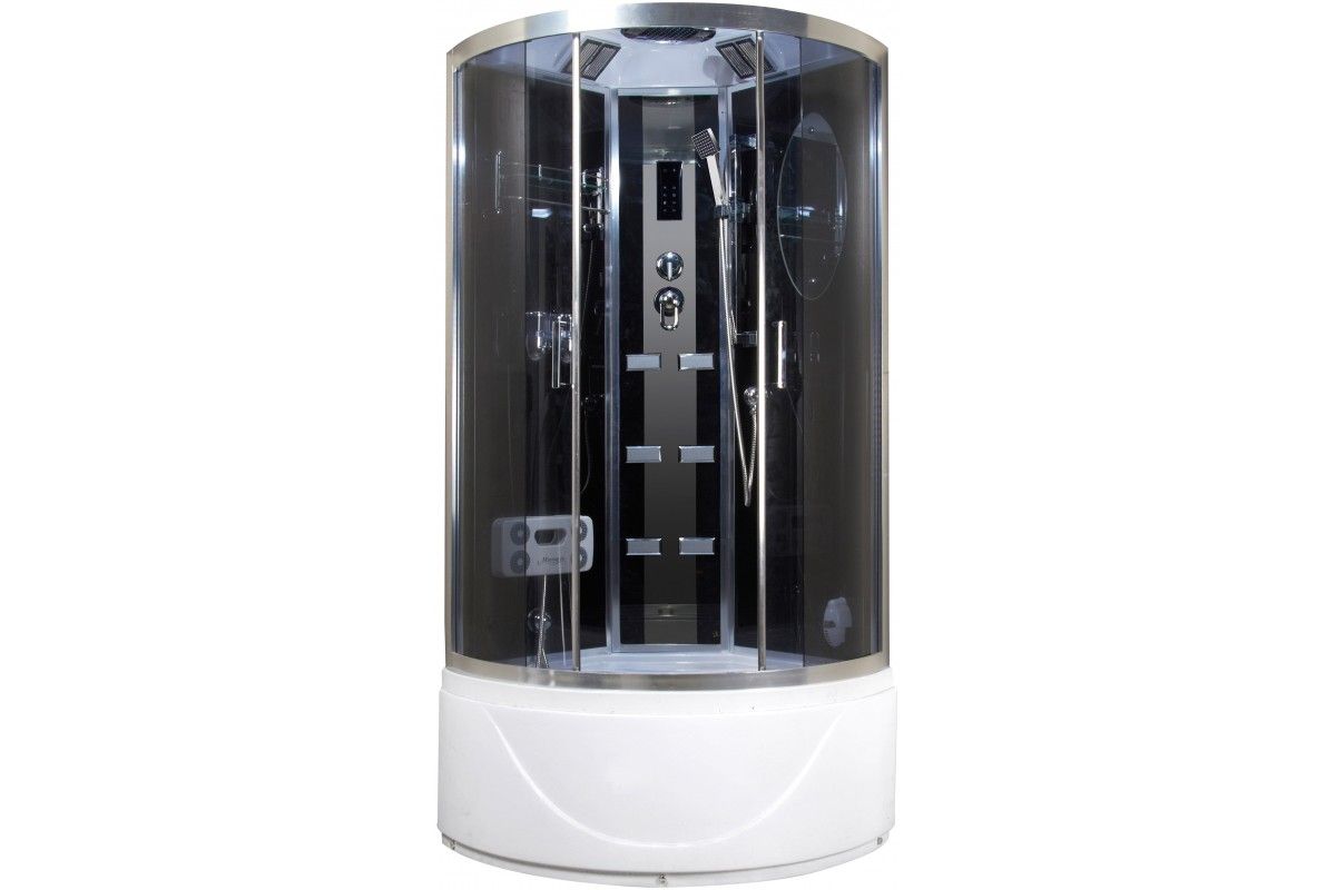 Поддон акриловый высокий 46см(сиденье на поддоне), глубина 30см, сифон с гофрой,экран съемный,профиль хром,центральная панель черно-зеркальная, задние стенки закаленные,черные, крашенные, передние стекла закаленные,тонированные, смеситель 4-х режимный,полочка,пульт, подсветка, верхний душ,ручной душ,зеркало,гидромассаж, дозатор,массажер ног.