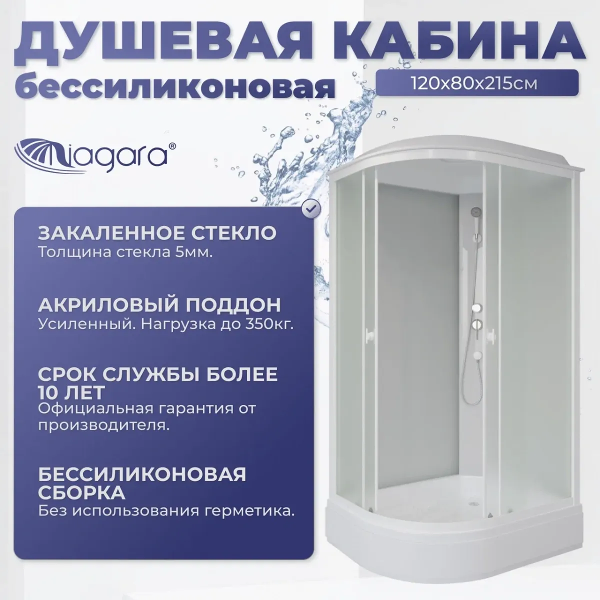 Душевая кабина Niagara Promo P120/80/26R/MT праваяБессиликоновая душевая кабина Niagara Promo P120/80/26R/MT ПраваяРазмеры 120x80x215 см Душевая кабина, в простой комплектации серия Promo, основные функции тропический душ и ручная лейка. Поддон акриловый на железном каркасе, высота поддона от пола 26 см, внутренняя глубина чаши 13 см. Чаша поддона установлена на металлический каркас, с регулируемыми ножками. Нагрузка на поддон до 300 кгСтенки задние закаленное стекло 4 мм - белое матовое. Стенки передние закаленное стекло 4 мм - белое матовое.Смеситель латунь с керамическим картриджем (устойчивый к плохой воде - гарантия 10 лет)На крыше расположен тропический душ.Ручная лейка устанавливается на любую высоту (держатель в комплекте)