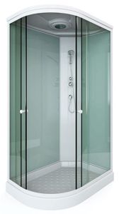 поддон низкий 15см фронтальные стекла: матовые фактурные задние стекла : белые матовые задняя панель: белый пластик белый алюминиевый профиль регулируемые ролики белые ручки для дверей 2 -режимный смеситель ручная лейка слив с сифоном крыша с верхней лейкой