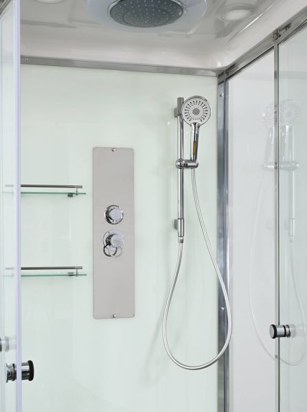 Стильная душевая кабина AvaCan сочетает в себе высокую функциональность, практичность и надежность. При изготовлении применяется безопасное закаленное стекло, надежно фиксируемое алюминиевым профилем. Профиль сделан из алюминия повышенной прочности. Сборка без силикона (увеличивает срок службы, защищает от протечек), внутренняя сборка (облегчает установку и ревизию; позволяет установить в ограниченном пространстве и обойтись без демонтажа других сантехнических приборов), смеситель резьбовой (без хомутов).Двойные металлические ролики дверей (распределение нагрузки на два ролика, увеличивают срок службы). Душевая штанга(позволяет регулировать по высоте ручную лейку), ручная арома-лейка с витамином С (картридж в комплекте,есть возможность замены или удаления картриджа), полочки(из стекла, с ограничителем), сифон с гидрозатвором.