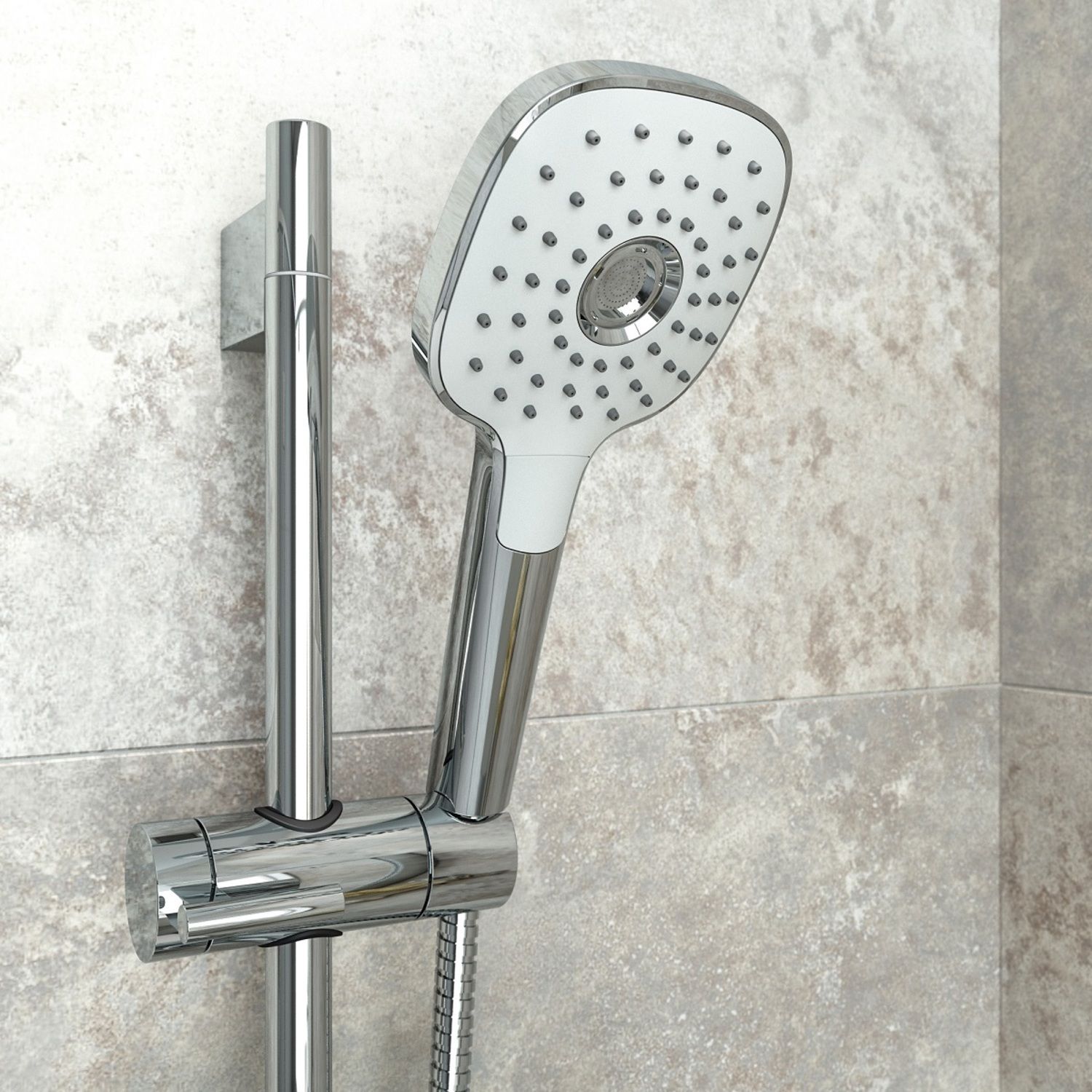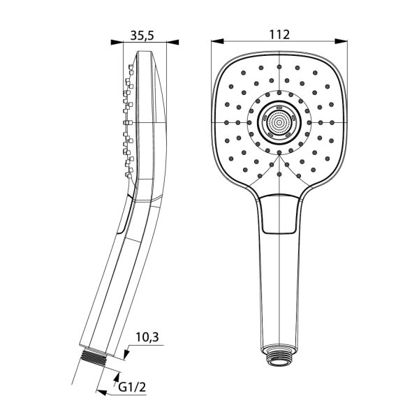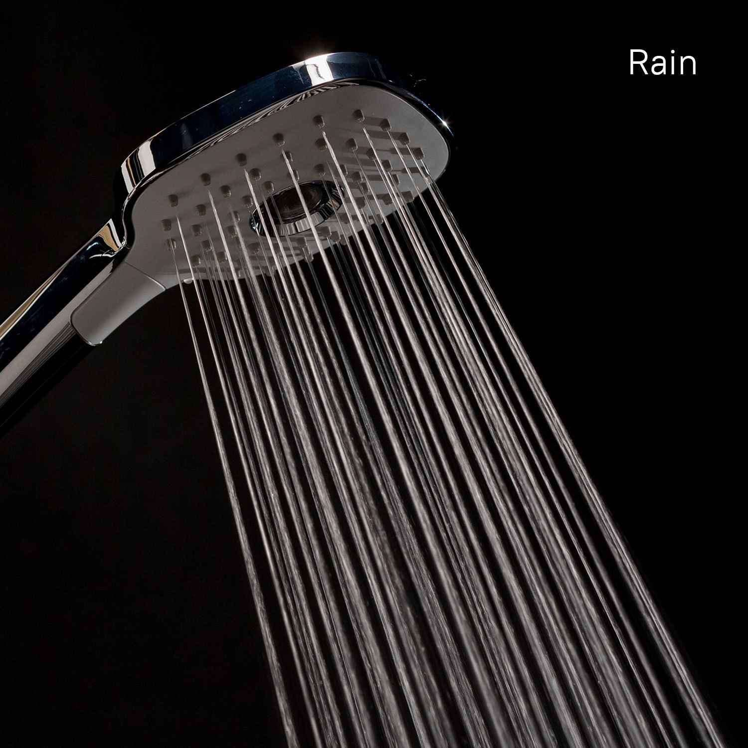 Лейка для душа из ABS-пластика, 3 режима (Rain, Relax-Massage, Rain&Relax-Massage), кнопочное переключение режимов, встроенная мембрана из нержавеющей стали, размер 112х255 мм, цвет - белый/хром.