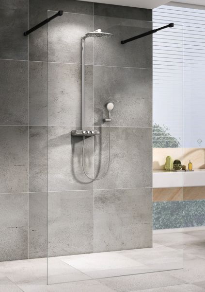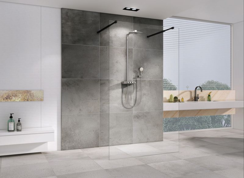 Это решение экономит место в ванной комнате. Также с помощью неподвижной стенки можно, например, отгородить стиральную машину, шкаф, раковину или унитаз.
