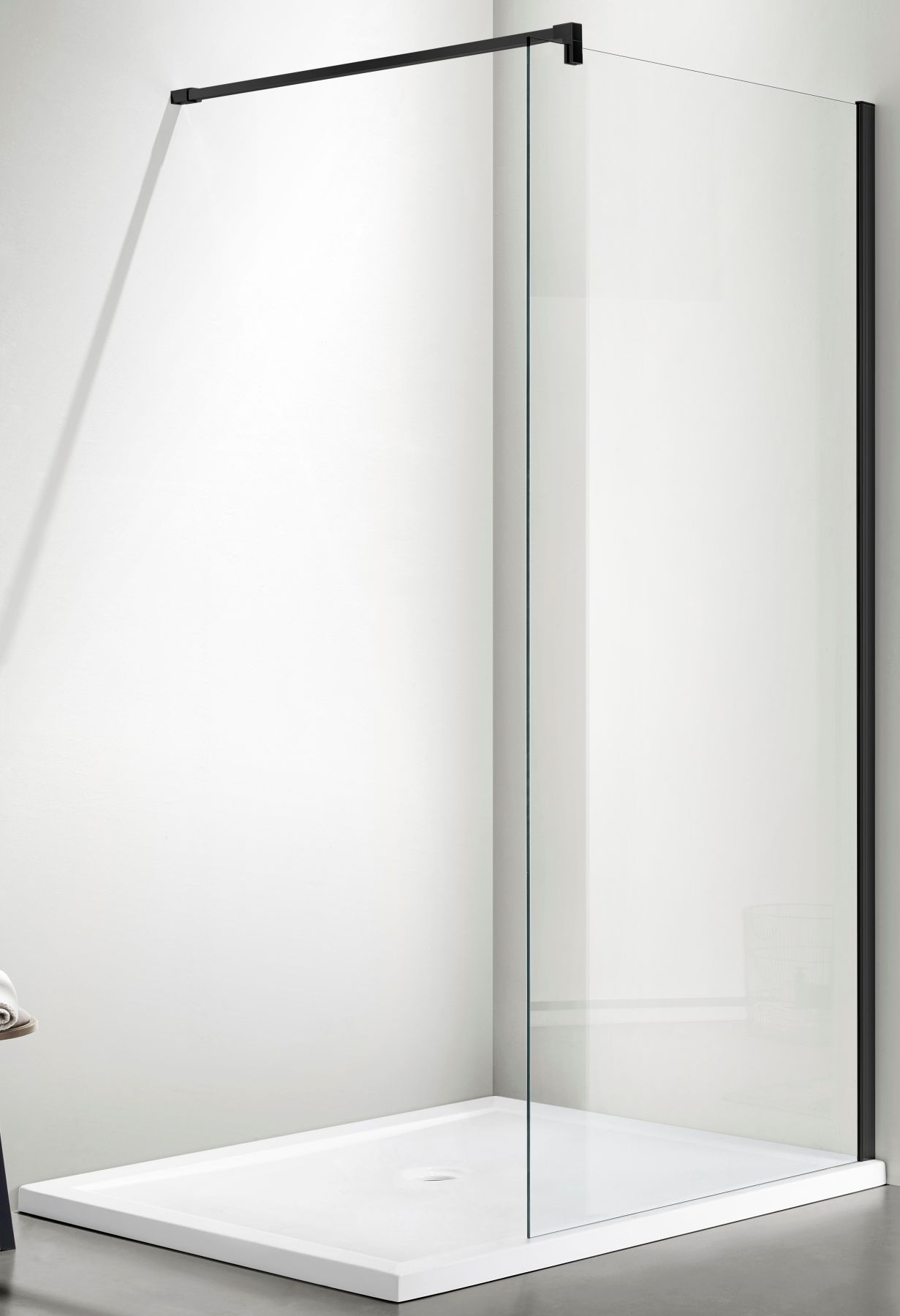 Это решение экономит место в ванной комнате. Также с помощью неподвижной стенки можно, например, отгородить стиральную машину, шкаф, раковину или унитаз.