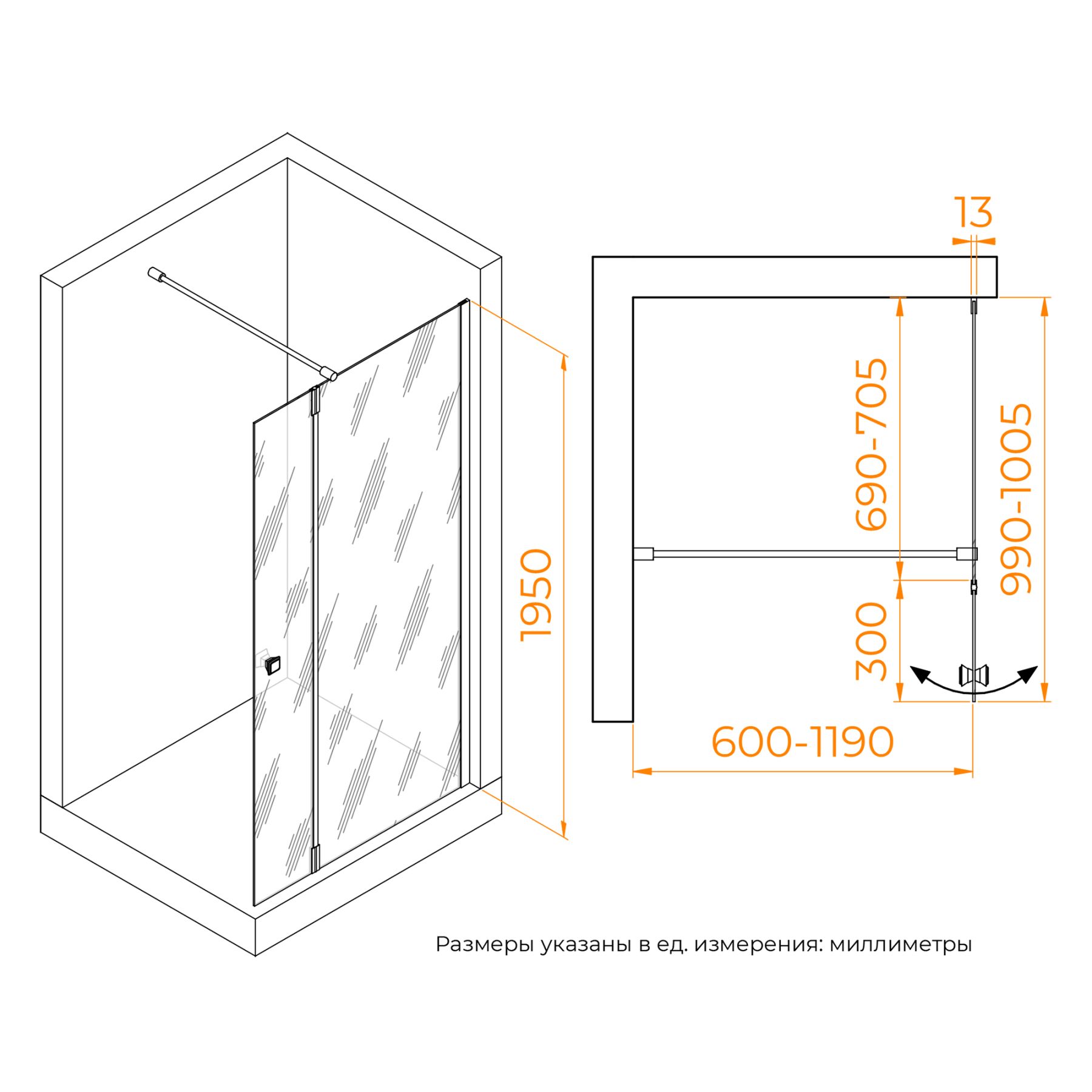 Душевая перегородка состоит из стационарного полотна и полотна с поворотной маятниковой частью - 300 мм. Стационарное стекольное полотно крепится к стене алюминиевым профилем с декоративной заглушкой. Подвижное полотно закреплено стальной маятниковой петлей с ходом 180 градусов.