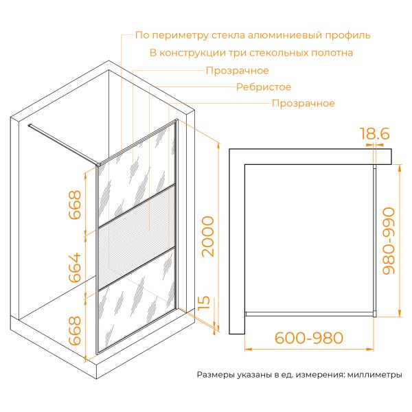 Высота изделия: 2000 мм (2 метра)Душевая перегородка изготовлена из закаленного стекла 8 мм. Стекло имеет высокую степень прочности и блеска!Гарантия: 3 года
