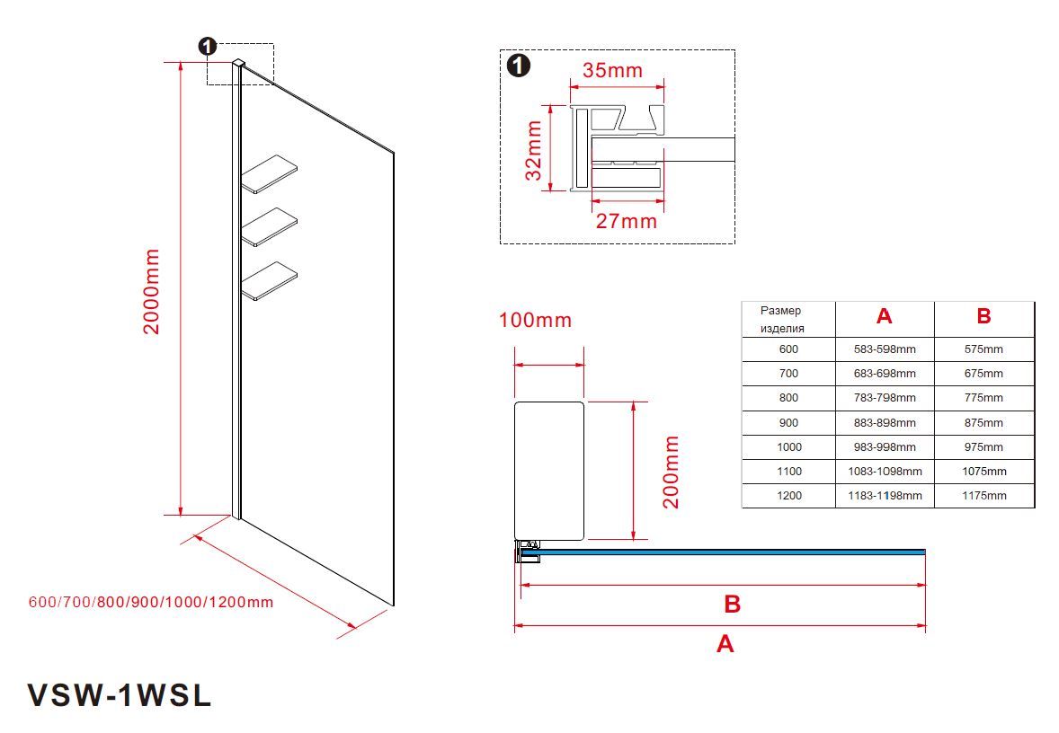 Душевая перегородка Vincea Walk-In VSW-1HWS100CLB, 1000*2000, черный, стекло прозрачноe