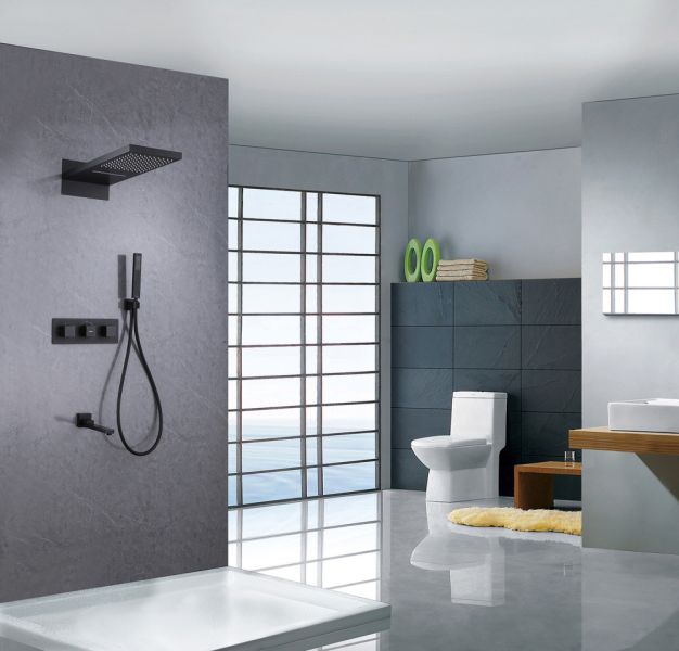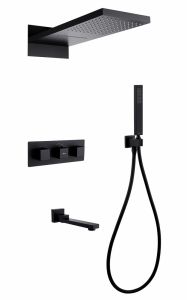 Душевой комплект ABBER отлично дополнит ванную комнату своим незаменимым функционалом. Душевые комплекты ABBER включают в себя все необходимое для создания идеального душевого пространства. Душевой комплект ABBER производится из высококачественных материалов, с отсутствием вредных примесей. Основной цвет исполнения ABBER – хром, идеально подходящий к душевой зоне выполненной в стиле hi-tech. Душевой комплект ABBER правильное решение в оснащении ванной комнаты.Душевая система скрытого монтажа с изливом, термостат, чёрный матовый
