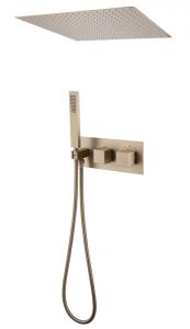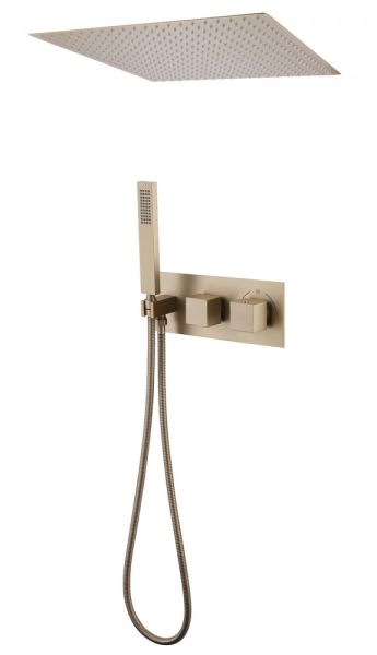 Душевой комплект ABBER отлично дополнит ванную комнату своим незаменимым функционалом. Душевые комплекты ABBER включают в себя все необходимое для создания идеального душевого пространства. Душевой комплект ABBER производится из высококачественных материалов, с отсутствием вредных примесей. Основной цвет исполнения ABBER – хром, идеально подходящий к душевой зоне выполненной в стиле hi-tech. Душевой комплект ABBER правильное решение в оснащении ванной комнаты.Душевая система скрытого монтажа без излива, термостат, золото матовое