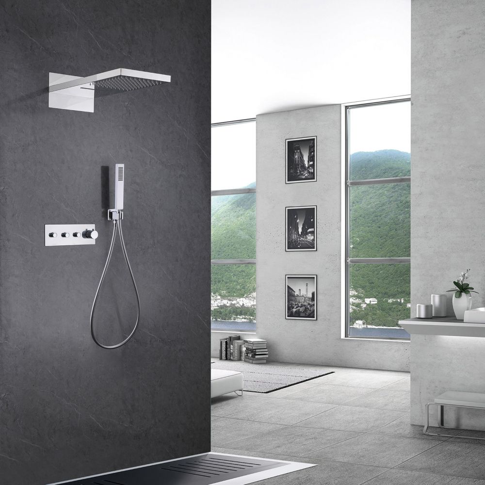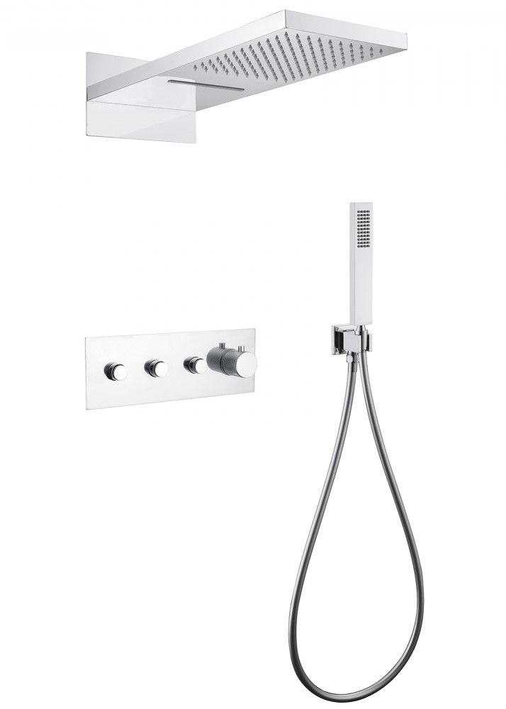 Душевой комплект ABBER отлично дополнит ванную комнату своим незаменимым функционалом. Душевые комплекты ABBER включают в себя все необходимое для создания идеального душевого пространства. Душевой комплект ABBER производится из высококачественных материалов, с отсутствием вредных примесей. Основной цвет исполнения ABBER – хром, идеально подходящий к душевой зоне выполненной в стиле hi-tech. Душевой комплект ABBER правильное решение в оснащении ванной комнаты.Душевая система скрытого монтажа без излива, термостат, хром