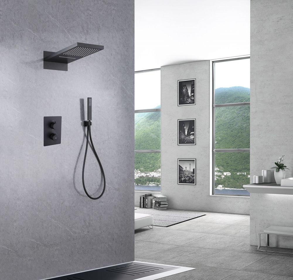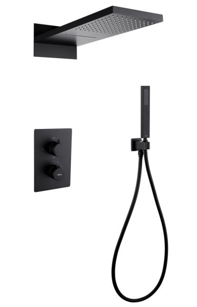 Душевой комплект ABBER отлично дополнит ванную комнату своим незаменимым функционалом. Душевые комплекты ABBER включают в себя все необходимое для создания идеального душевого пространства. Душевой комплект ABBER производится из высококачественных материалов, с отсутствием вредных примесей. Душевой комплект ABBER правильное решение в оснащении ванной комнаты.Душевая система скрытого монтажа без излива, термостат, черная матовая