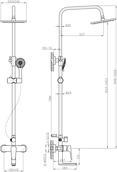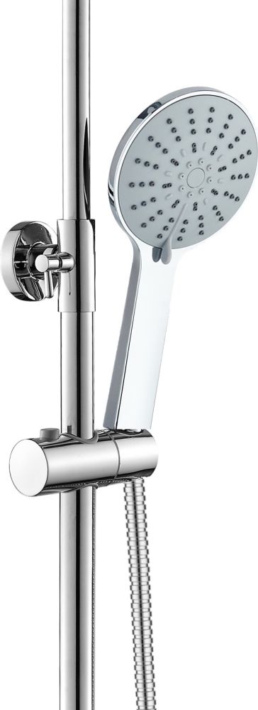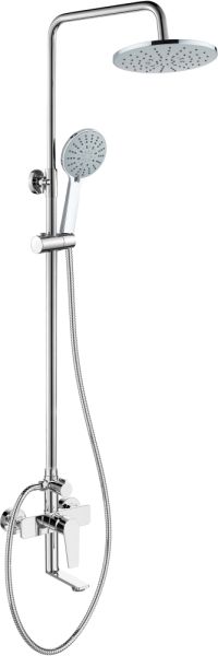 Agger Brilliant A0393300 Душевая система со смесителем для ванны/душа (керамический картридж, поворотный излив 18,4 см): пятирежимный ручной душ 120 мм с регулируемым по высоте и наклону держателем, верхний душ 200 мм с регулировкой угла наклона и силиконовыми наконечниками (защита от известкового налета), телескопическая штанга, шланг 150 см. с защитой от перекручивания.