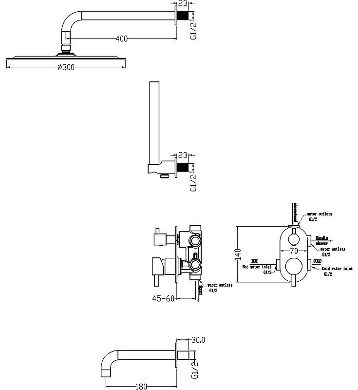 Размер верхнего душа: 300 мм.