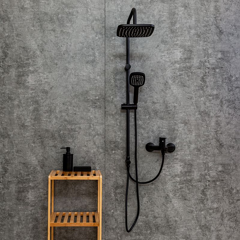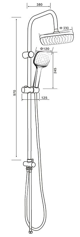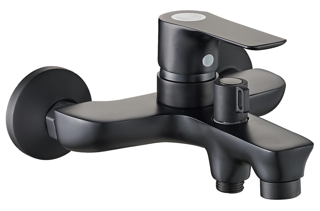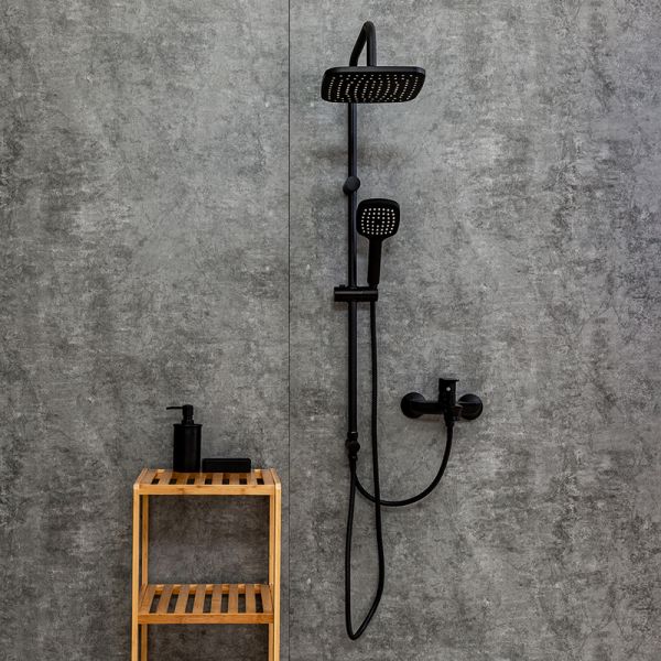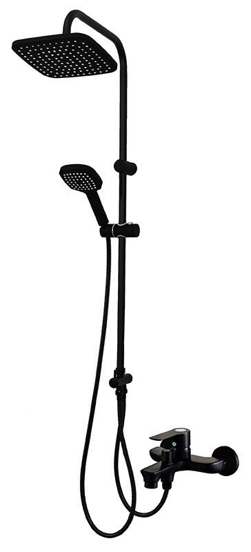 Душевая система в комплекте: однозахватный смеситель для ванны с изливом (190 мм.) и керамическим картриджем, верхний душ 230х230 мм. и ручной душ 120 мм (1 режим) с защитой от известкового налета, регулируемый по наклону держатель верхнего и ручного душа, душевой шланг 1,5 м. (в металлической оплетке, с защитой от перекручивания), керамический дивертор. Штанга 970 мм. с возможностью установки в старые отверстия. Цвет матовый черный, за которым просто ухаживать мягкой салфеткой, получен порошковой окраской с многоступенчатой системой подготовки и высокотемпературной обработкой.