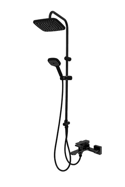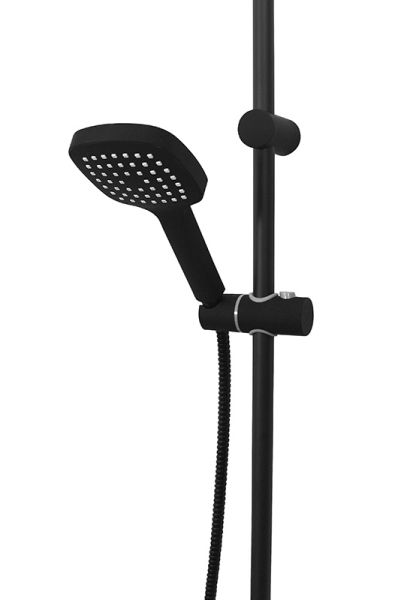 Душевая система Orange M04-944b: однозахватный смеситель для ванны с изливом, верхний душ 230х230 мм с регулировкой угла наклона, ручной душ 120 мм - 1 режим струи, регулируемый по высоте и наклону держатель ручного душа, форсунки верхнего и ручного душа с функцией легкой очистки от известкового налета, душевой шланг 1,5 м с защитой от перекручивания, штанга с возможностью установки в старые отверстия, керамический дивертор. Цвет матовый черный.