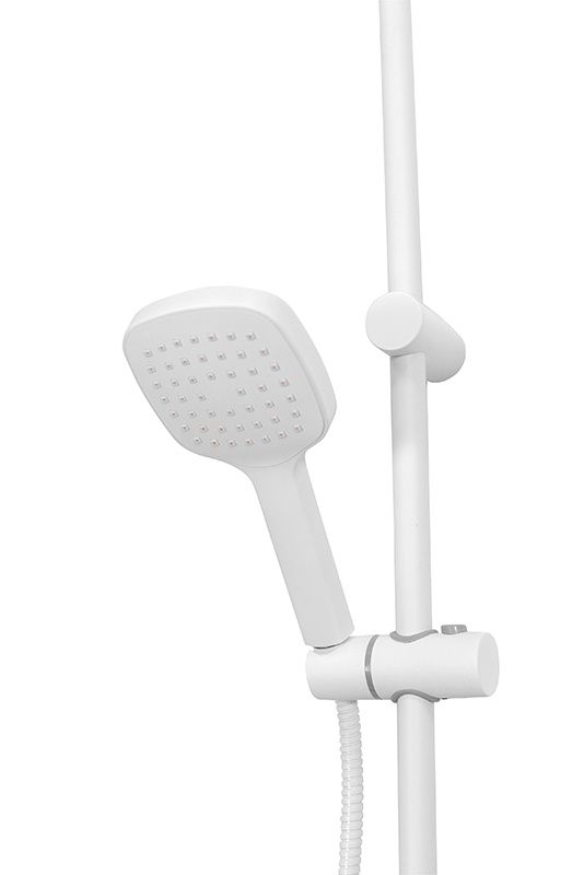 Душевая система Orange M04-944w: однозахватный смеситель для ванны с изливом, верхний душ 230х230 мм с регулировкой угла наклона, ручной душ 120 мм - 1 режим струи, регулируемый по высоте и наклону держатель ручного душа, форсунки верхнего и ручного душа с функцией легкой очистки от известкового налета, душевой шланг 1,5 м с защитой от перекручивания, штанга с возможностью установки в старые отверстия, керамический дивертор. Цвет глянцевый белый.