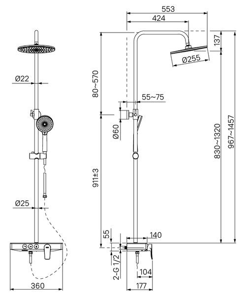 Шланг из ПВХ (1,5 м), ручная лейка и держатель для лейки идут в комплекте.