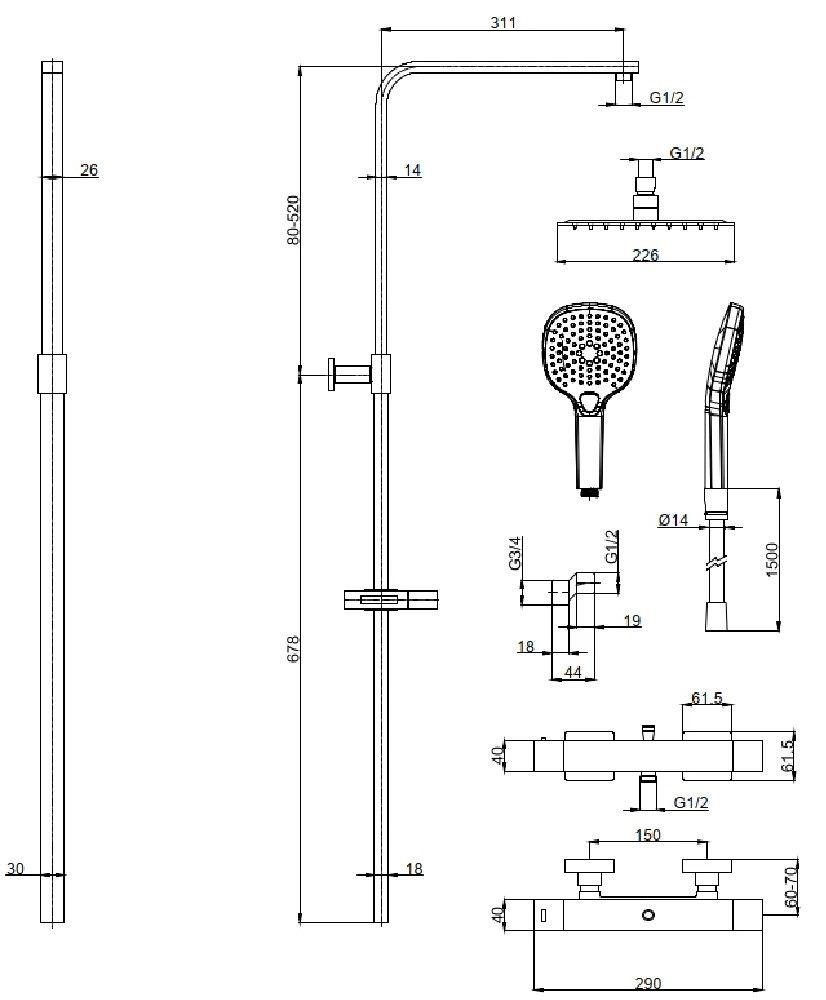 состоит из: верхний душ, ручной душ, термостатический смеситель для душа, штанга для душа, держатель для душаверхний душ 2261jetразмер душевого диска: 226 x 226 ммтип струи: Rainдушевая лейка 120 мм, 3 режима струишарнирное соединение: регулируемый угол верхнего душадлина держателя для душа: 311 ммдержатель для ручного душа регулируемый по высотеповоротный держатель для душавид монтажа: внешний монтажсоединительная резьба G ½межосевое подключение 150 мм ± 12 ммподъемная труба может быть укорочена по высоте 80-520 ммИталия2 года гарантии