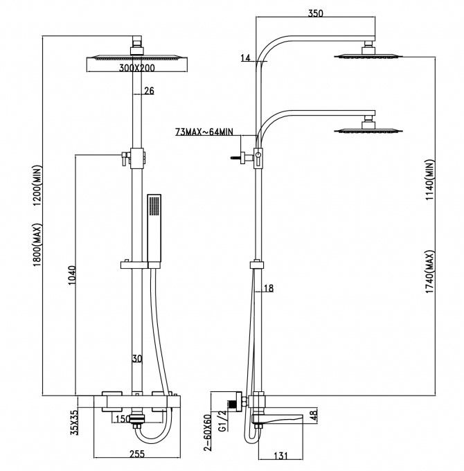 • Регулировка верхнего душа по высоте: 114 - 174 см.