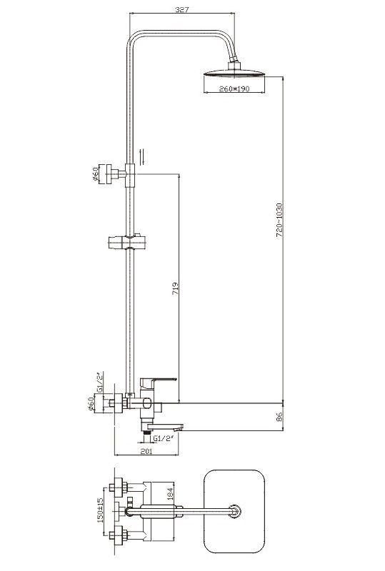 Душевая система Haiba.Изготовлена из высококачественной латуни.Прекрасный тропический душ.Излив для наполнения ванны.Душевая штанга регулируется по высоте от 72 см до 103 см.