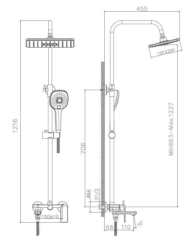 Душевая система Haiba.Изготовлена из высококачественной латуни.Прекрасный тропический душ.Излив для наполнения ванны.Душевая штанга регулируется по высоте от 66,3 см до 122,7 см.
