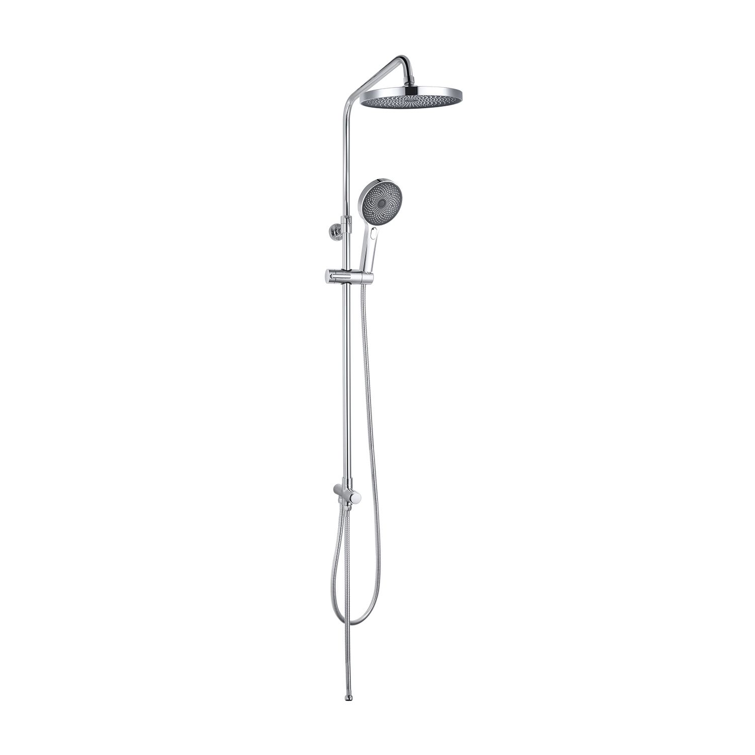 Стойка из нержавеющей стали диаметром 22 мм, регулируемая высота 950-1300 мм. Верхняя лейка из ABS-пластика 1-режимная, диаметр 260 мм. Цвет: корпус - хром, лицевая часть - тёмно-серая, форсунки белые из силикона. Шарнирное крепление. Ручная лейка из ABS-пластика 3-режимная, диаметр 130 мм, кнопочное переключение режимов. Цвет: корпус - хром, лицевая часть - тёмно-серая, форсунки белые из силикона. Кнопочный дивертор из латуни. Держатель-слайдер из ABS-пластика. Шланги из ПВХ с оплёткой из нержавеющей стали 1,5 м и 0,6 м.