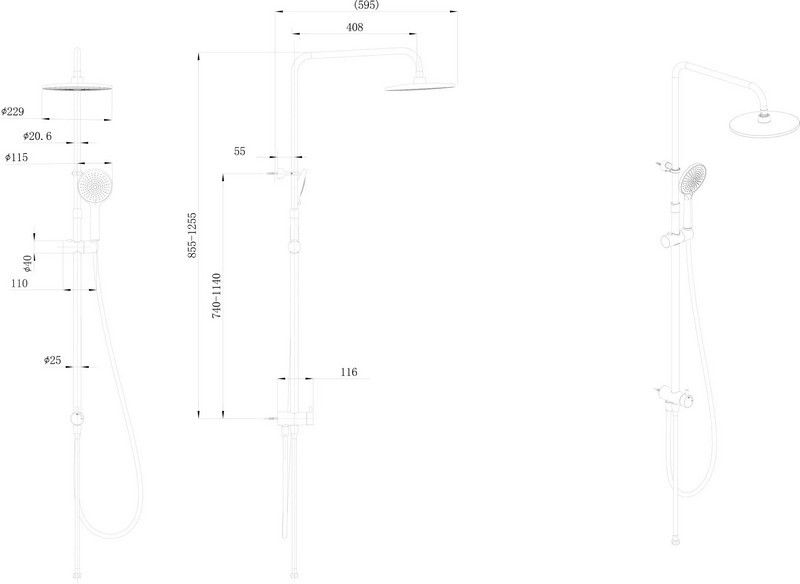 Верхний душ и ручная лейка имеют круглую форму. Стойка выполнена из нержавеющей стали, круглая в сечении. У ручной лейки предусмотрены три режима потока. Регулировка высоты при установке — 855-1255 мм.