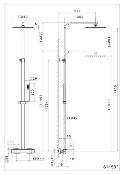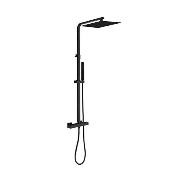 Душевая колонна с термостатическим смесителем в комплекте с переключателем потоков, квадратной верхней одноструйной душевой лейкой из нержавеющей стали, с ручным душем и шлангом из ПВХ. Внимание: для чистки черных и цветных изделий можно применять только мягкую губку и мыльный раствор. Использование моющих и абразивных средств запрещено.