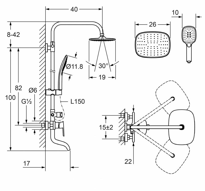 верхний душ, ручной душ, душевой шланг, s-образные эксцентрики, набор прокладок.