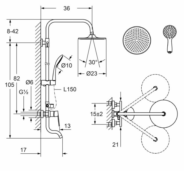 Вылет верхнего душа, см 36