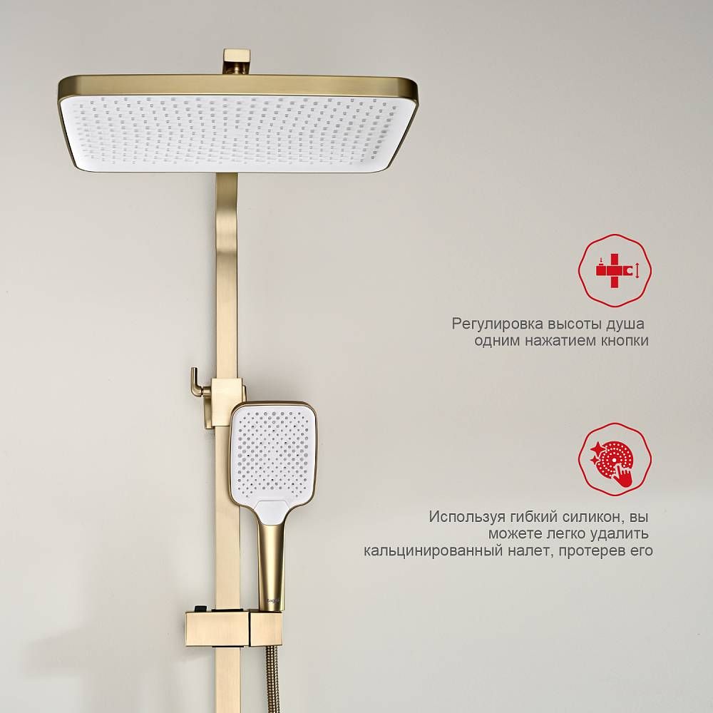 Душевая система Raglo R01.24.03.Цвет: сатин золотой.Материал: латунь.Управление: однорычажное.Механизм: керамический картридж.Излив: поворотный. Аэратор.Регулируемая по высоте душевая штанга: 1026-1566 мм.Форма верхнего душа: прямоугольная.Размер верхнего душа (ШхД): 340х220 мм.Регулируемый по высоте держатель ручного душа.Форма ручного душа: прямоугольная.Количество режимов струи ручного душа: 3.Отверстия для монтажа: 3.Стандарт подводки: G 1/2.Монтаж: на стену.