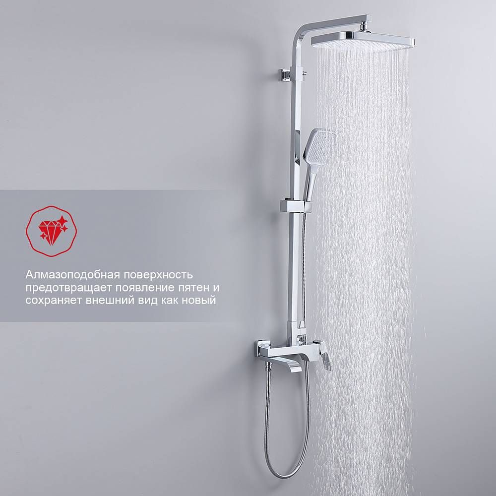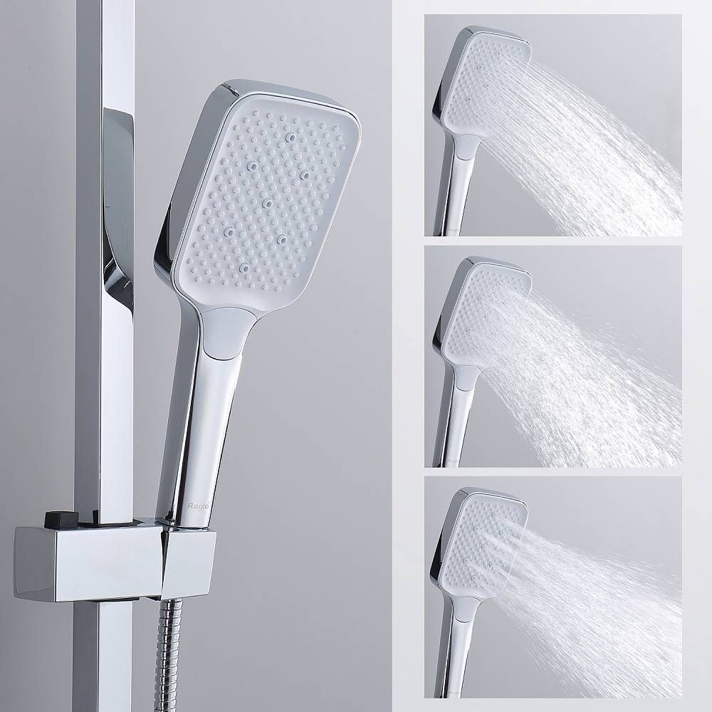 Душевая система Raglo R02.24.Цвет: хром.Материал: латунь.Управление: однорычажное.Механизм: керамический картридж.Излив: поворотный. Аэратор.Тип излива: каскадный.Регулируемая по высоте душевая штанга: 1082-1650 мм.Форма верхнего душа: прямоугольная.Размер верхнего душа (ШхД): 315х208 мм.Регулируемый по высоте и наклону держатель ручного душа.Форма ручного душа: прямоугольная.Количество режимов струи ручного душа: 3.Отверстия для монтажа: 3.Стандарт подводки: G 1/2.Монтаж: на стену.