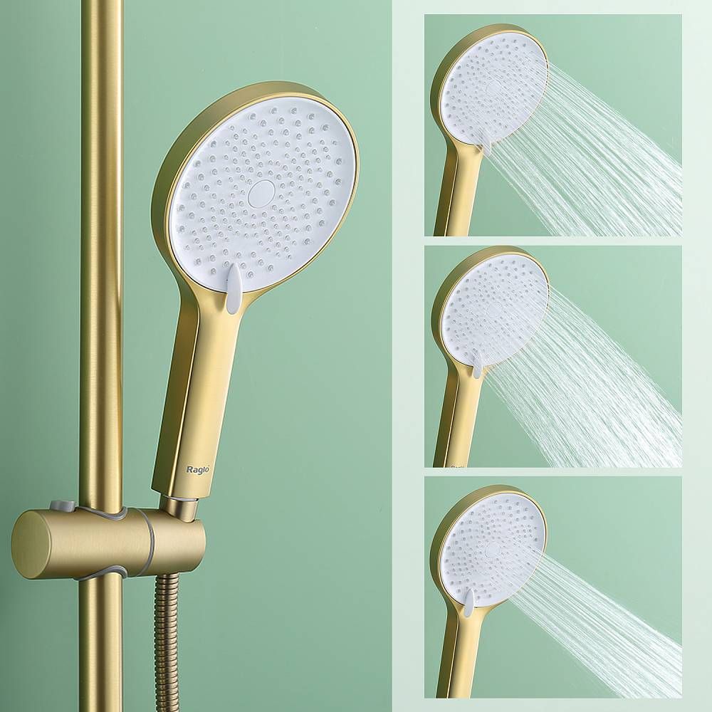 Душевая система Raglo R03.24.03Цвет: сатин золотой.Материал: латунь.Управление: однорычажное.Механизм: керамический картридж.Излив: поворотный. Аэратор.Регулируемая по высоте душевая штанга: 1065-1565 мм.Форма верхнего душа: круглая.Диаметр верхнего душа: 255 мм.Регулируемый по высоте и наклону держатель ручного душа.Форма ручного душа: круглая.Количество режимов струи ручного душа: 3.Отверстия для монтажа: 3.Стандарт подводки: G 1/2.Монтаж: на стену.