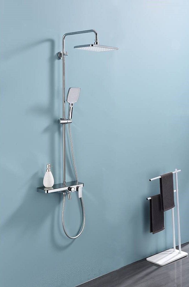 Душевая система Raglo R60.24.Материал: латунь.Управление: однорычажное.Механизм: керамический картридж.Скрытый излив с аэратором.Полка из стекла.Регулируемая по высоте душевая штанга: 1100-1530 мм.Форма верхнего душа: прямоугольная.Размер верхнего душа (ШхД): 300х200 мм.Регулируемый по высоте держатель ручного душа.Количество режимов струи ручного душа: 3.Переключение режимов ручного душа: кнопочное.Отверстия для монтажа: 3.Стандарт подводки: G 1/2.Монтаж: на стену.