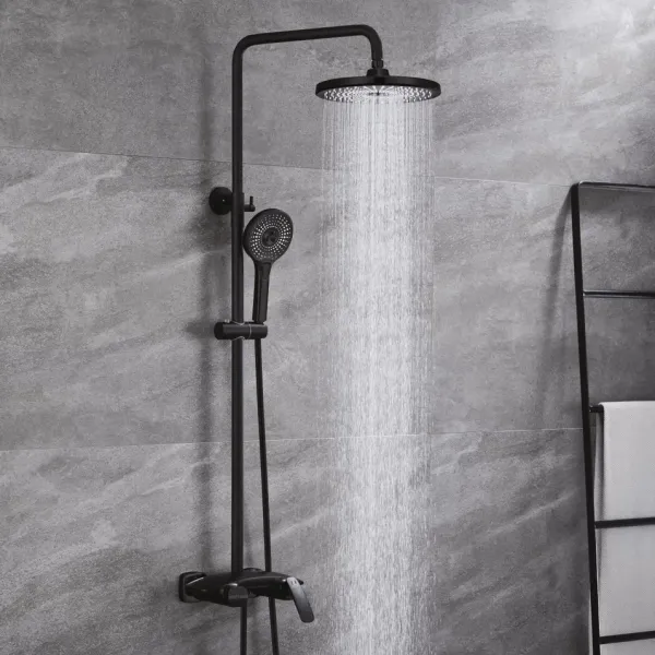 Душевая система с каскадным изливом Rose R1136H, черный.Монтаж: настенный.Стилистика дизайна: современный стиль.Управление: рычажное.Размер верхнего душа: 25x25.Форма верхнего душа: круглая.