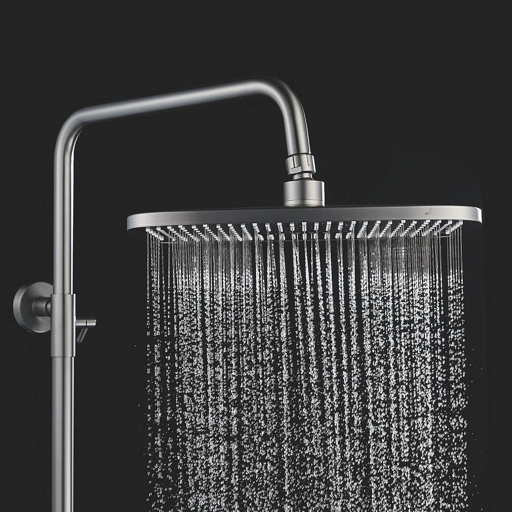 Верхний душ размером 310x210 мм из ABS-пластика легко регулируется по наклону благодаря встроенному шарниру. Он также оснащен самоочищающимися силиконовыми форсунками, которые защищают его от известкового налета, обеспечивая всегда чистый и сильный поток воды.