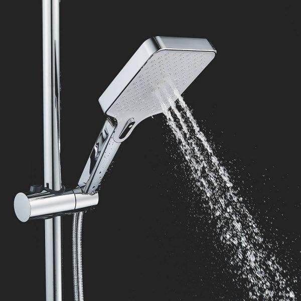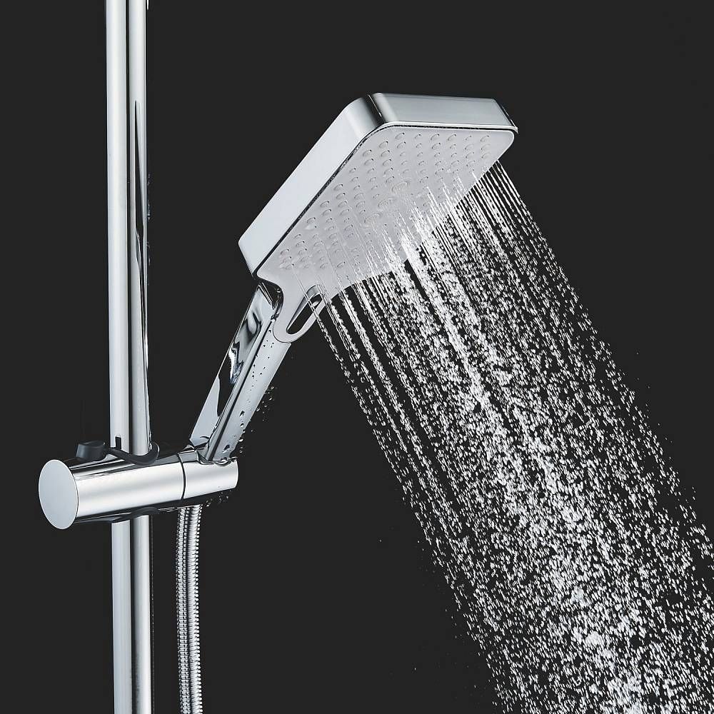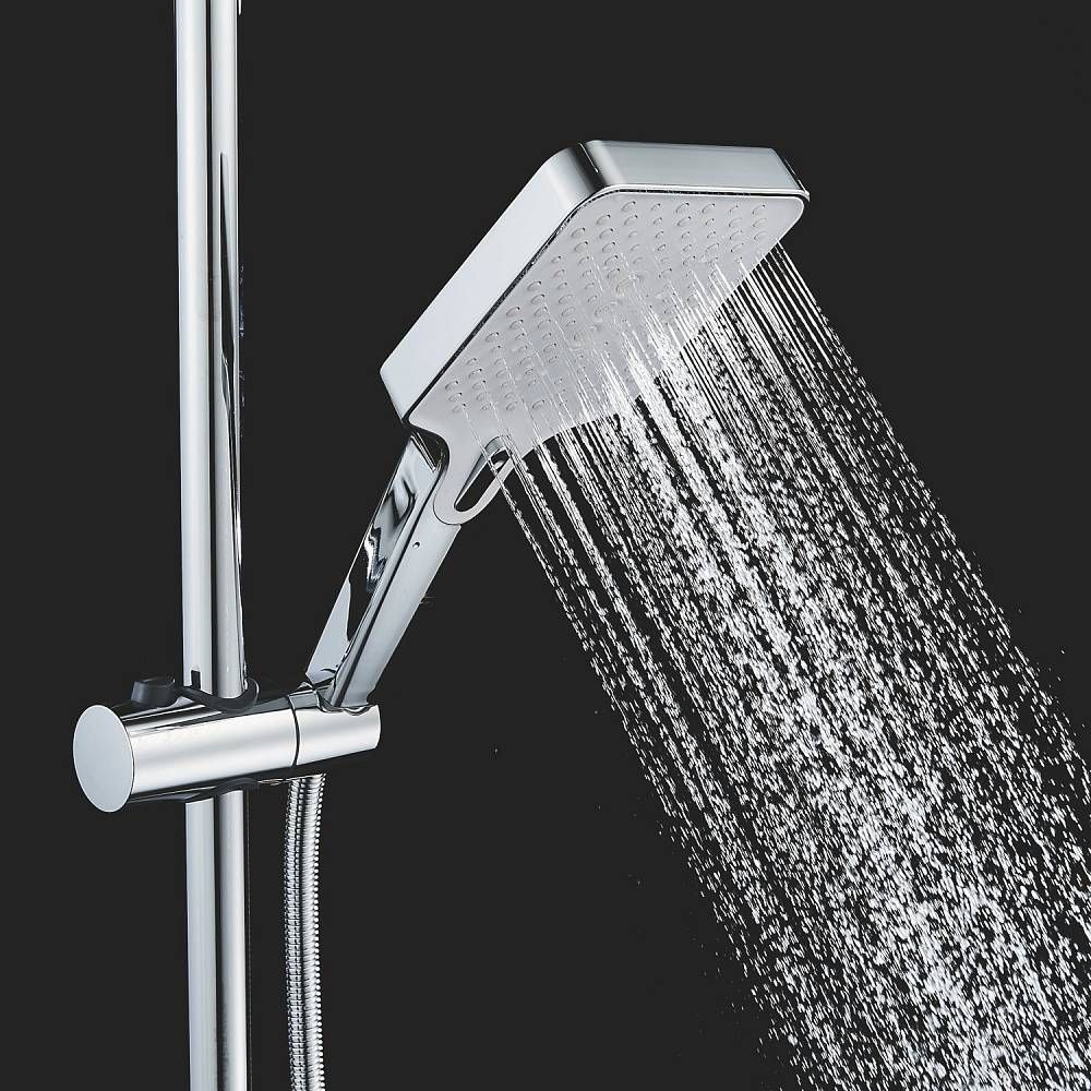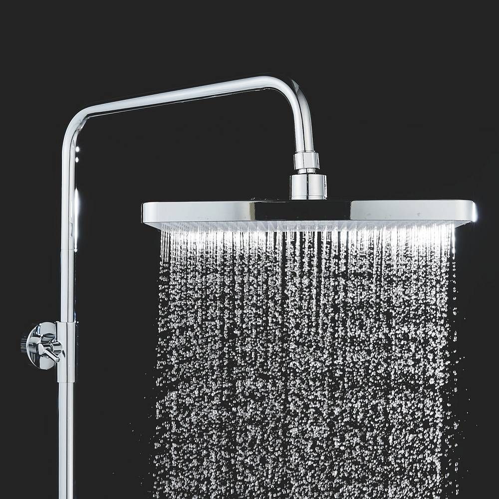 Верхний душ размером 305x205 мм из ABS-пластика регулируется по высоте благодаря телескопической штанге и по наклону с помощью встроенного шарнира, что обеспечивает максимальный комфорт и удобство использования. Самоочищающиеся силиконовые форсунки предотвращают образование известкового налета и сохраняют чистоту и силу потока воды.