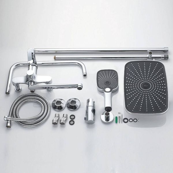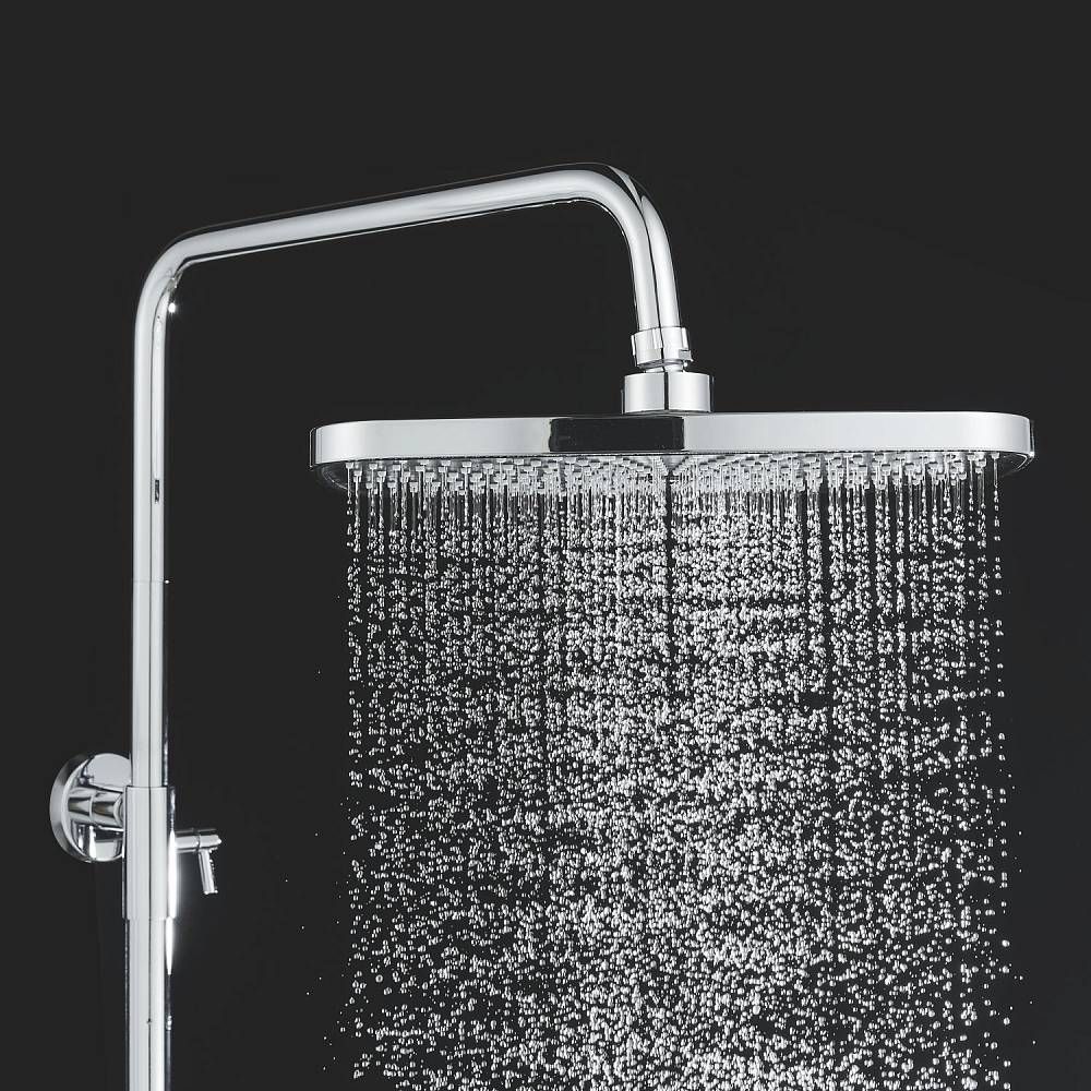 Верхний душ размером 300x190 мм из ABS-пластика регулируется по высоте благодаря телескопической штанге и по наклону с помощью встроенного шарнира, что обеспечивает максимальный комфорт и удобство использования. Самоочищающиеся силиконовые форсунки предотвращают образование известкового налета и сохраняют чистоту и силу потока воды.
