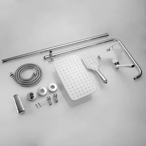 Душевая система Shevanik S8036F, белый/хром.Количество режимов струи: 3.Размер верхнего душа: 29,5x18 см.Управление: рычажное.Излив для наполнения ванны: да.