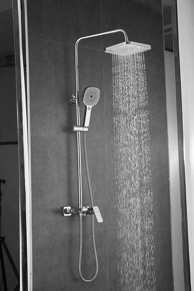 Душевая система Shevanik S9736, хром.Количество режимов струи: 3.Размер верхнего душа: 22,5x22,5 см.Управление: рычажное.Излив для наполнения ванны: да.