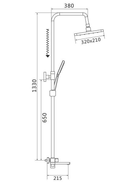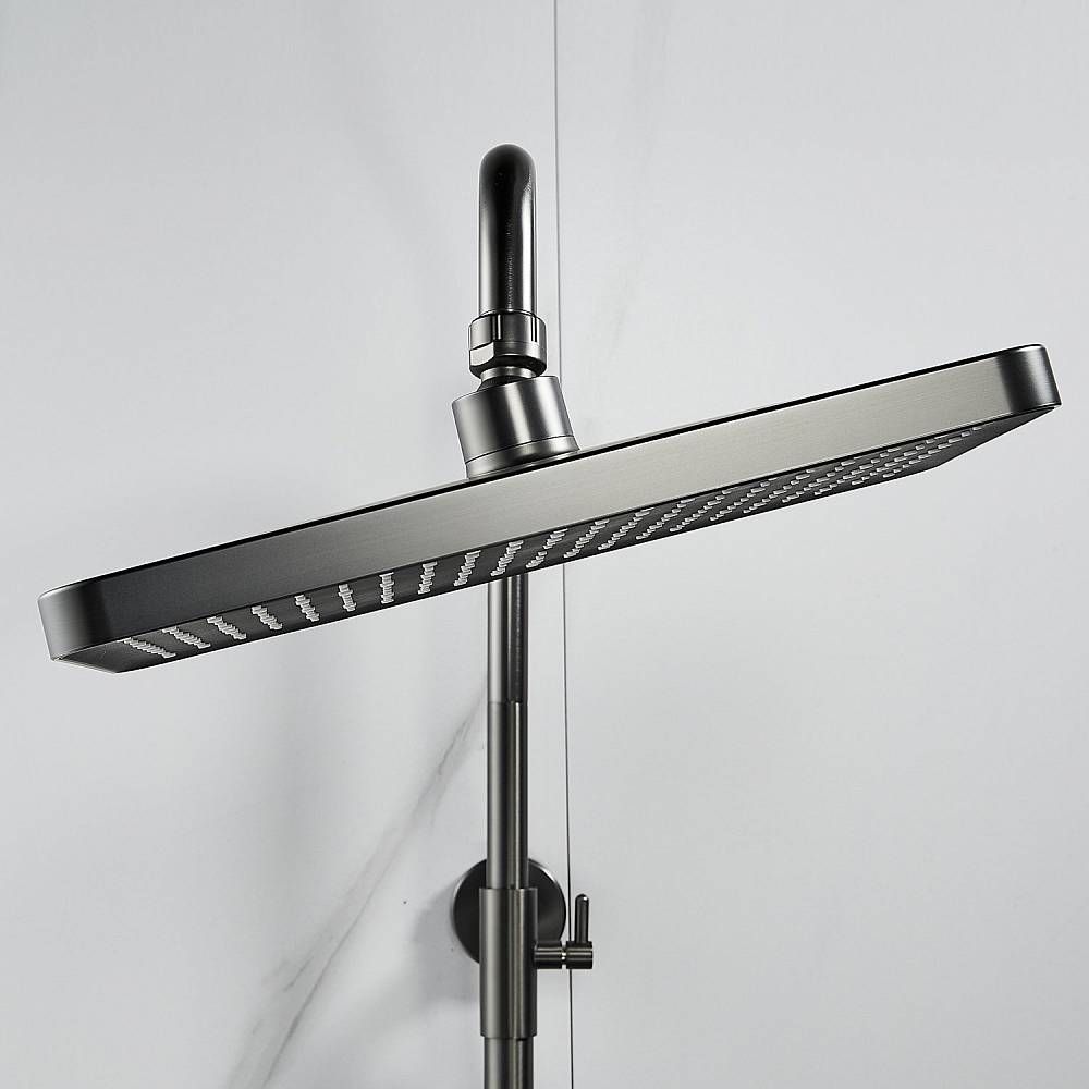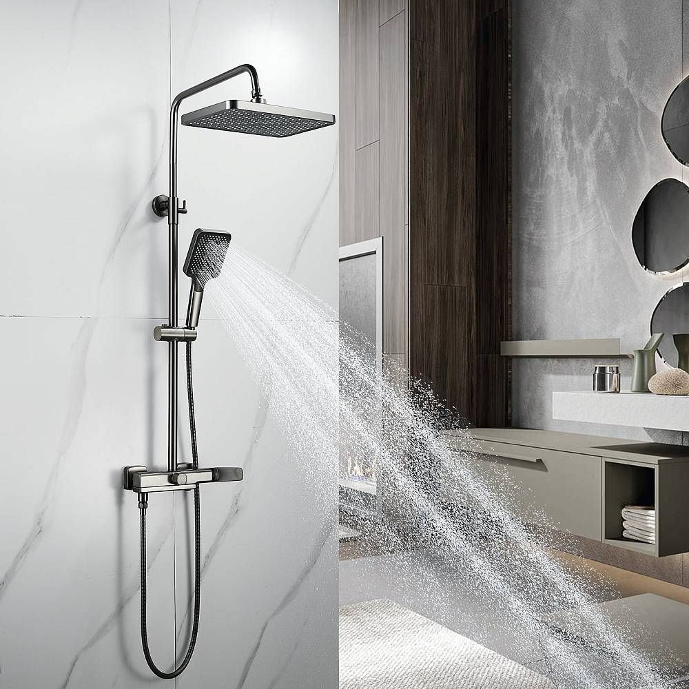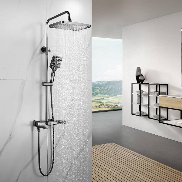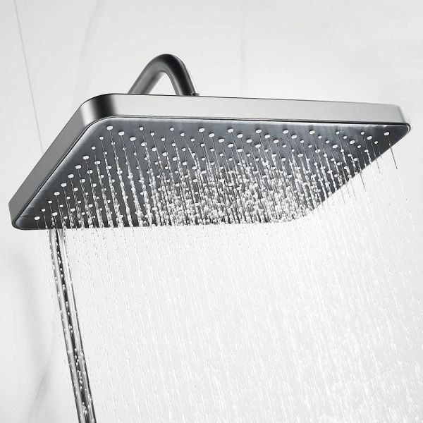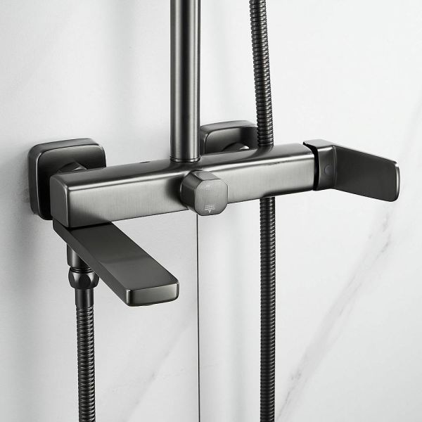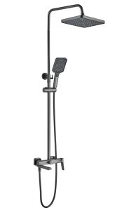 Душевая система Shevanik S9936T, оружейная сталь.Количество режимов струи: 3.Размер верхнего душа: 32x21 см.Управление: рычажное.Излив для наполнения ванны: да.