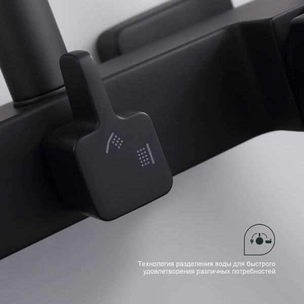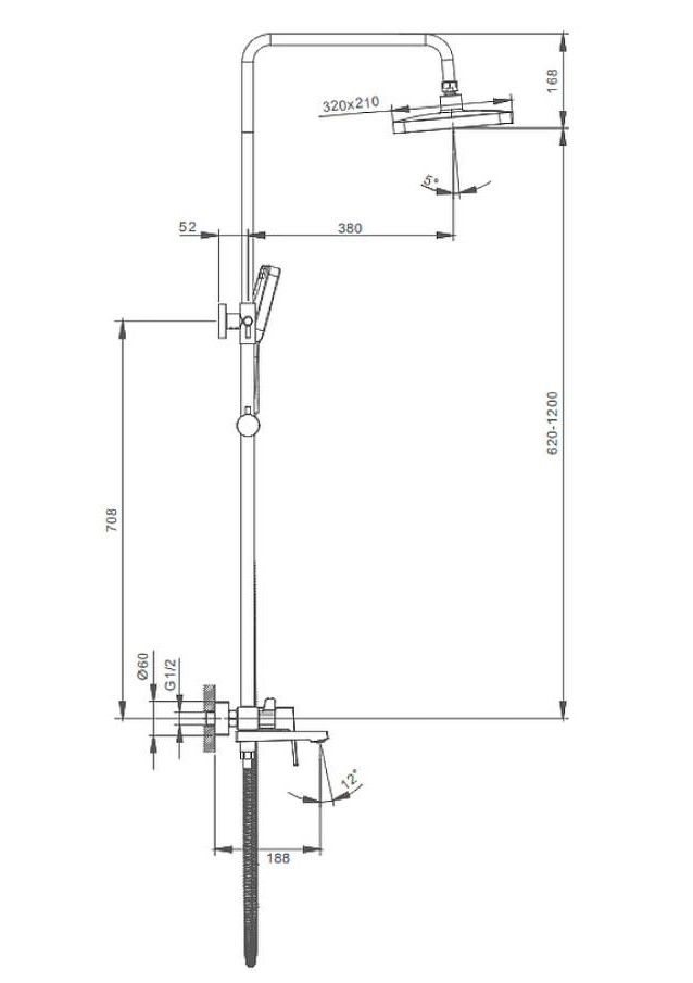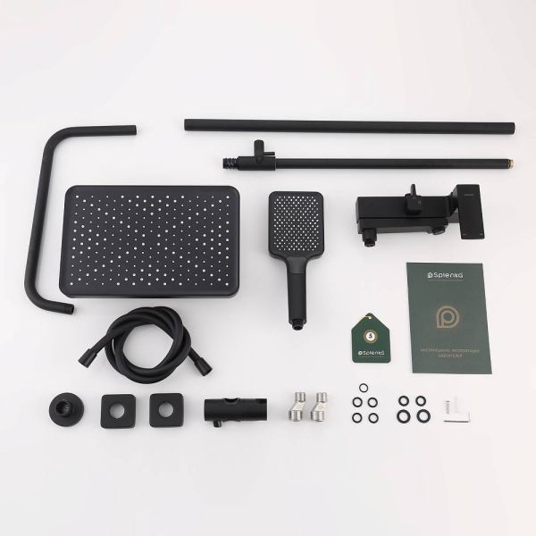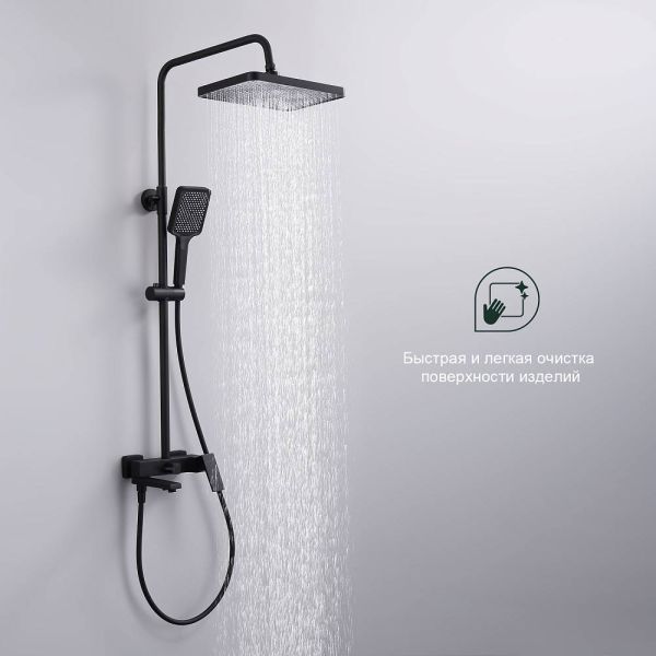 Душевая система Splenka S01.24.06. Цвет: черный. Материал: латунь. Управление: однорычажное. Механизм: керамический картридж. Излив: поворотный. Аэратор. Стандарт подводки: G 1/2. Форма верхнего душа: прямоугольная. Размер верхнего душа (ШхД): 320х210 мм. Количество режимов струи ручного душа: 3. Регулируемая душевая штанга: 620-1200 мм. Монтаж: на стену.